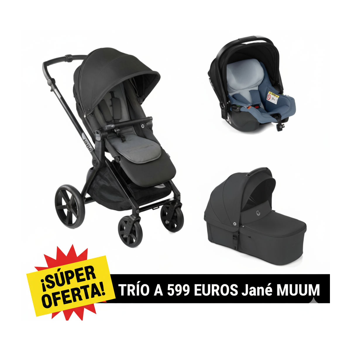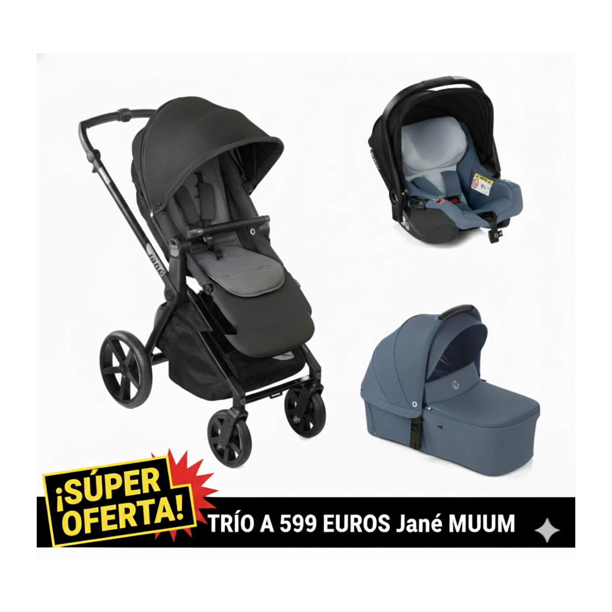 El cochecito Jané Muum en formato trío destaca por su diseño moderno y su excepcional funcionalidad. Pensado para la vida urbana, es ligero, compacto y fácil de manejar, ideal desde el nacimiento. La silla es reversible y se reclina completamente, garantizando el máximo confort. El pack trío incluye el chasis, la hamaca, un capazo ligero y un portabebés/grupo 0+ homologado. Compra el Jané Muum al mejor precio en trío por solo 599€. Esta es una oferta de unidades limitadas hasta agotar existencias, ¡no dejes escapar esta oportunidad!