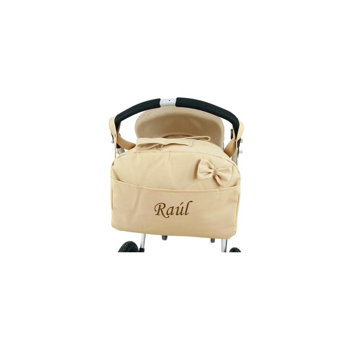 Bolso de Piel Carrito Lazo Beig. El complemento ideal para el carrito o silla de paseo de tu bebé, Admnistrador con gran espacio que te permitirá llevar contigo todos los accesorios que necesites. Será original y exclusivo porque es personalizado con el nombre de tu bebé.