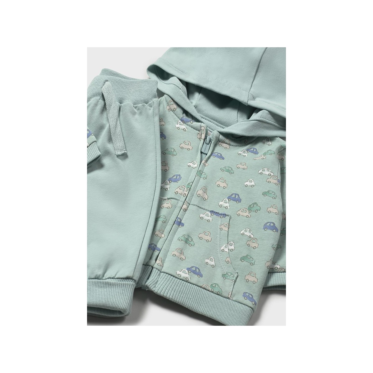 Este conjunto incluye una moderna chaqueta con estampado de coches , una camiseta body y un cómodo pantalón en tonos jade suaves.