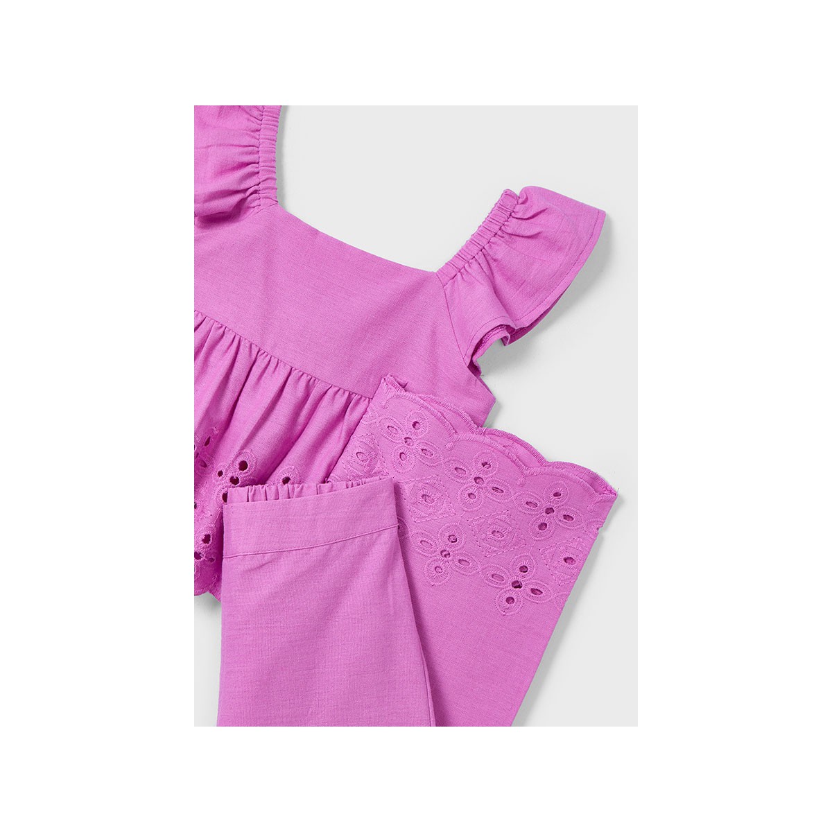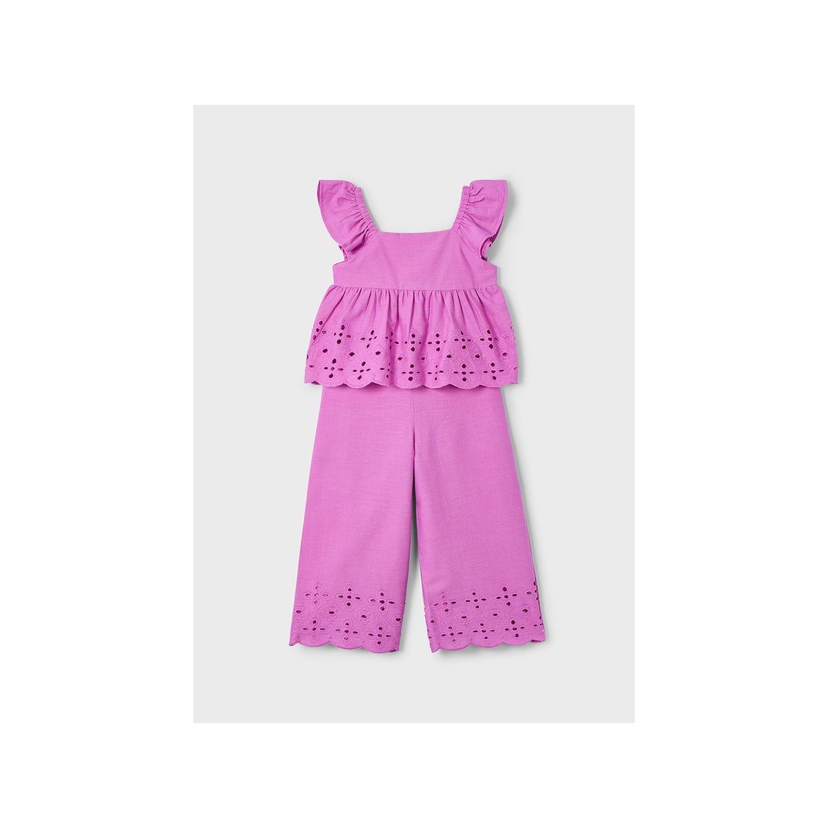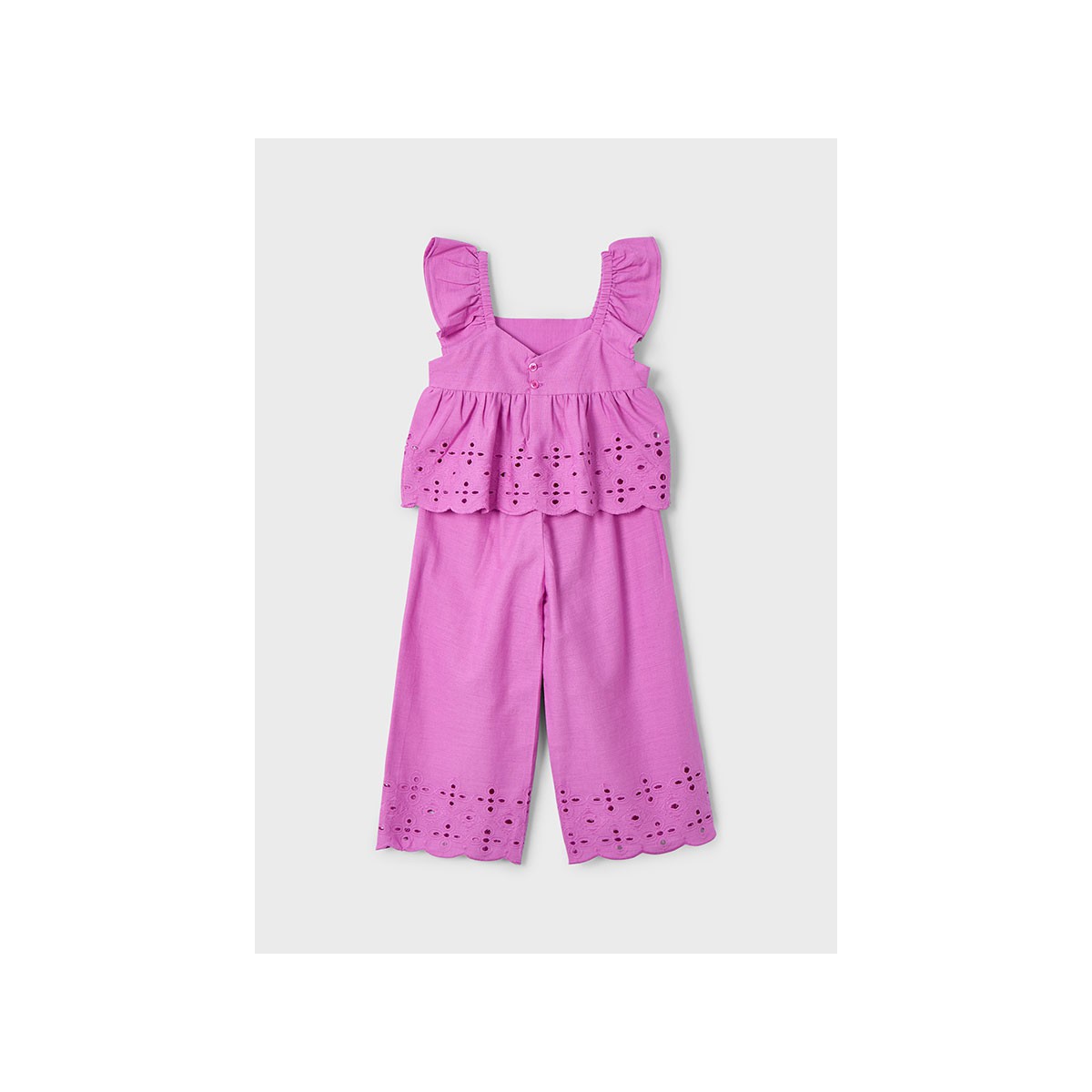 Elegante traje largo perforado Mayoral en fucsia para niñas. Diseño exclusivo con acabados de calidad, disponible en tallas de 2 a 6 años